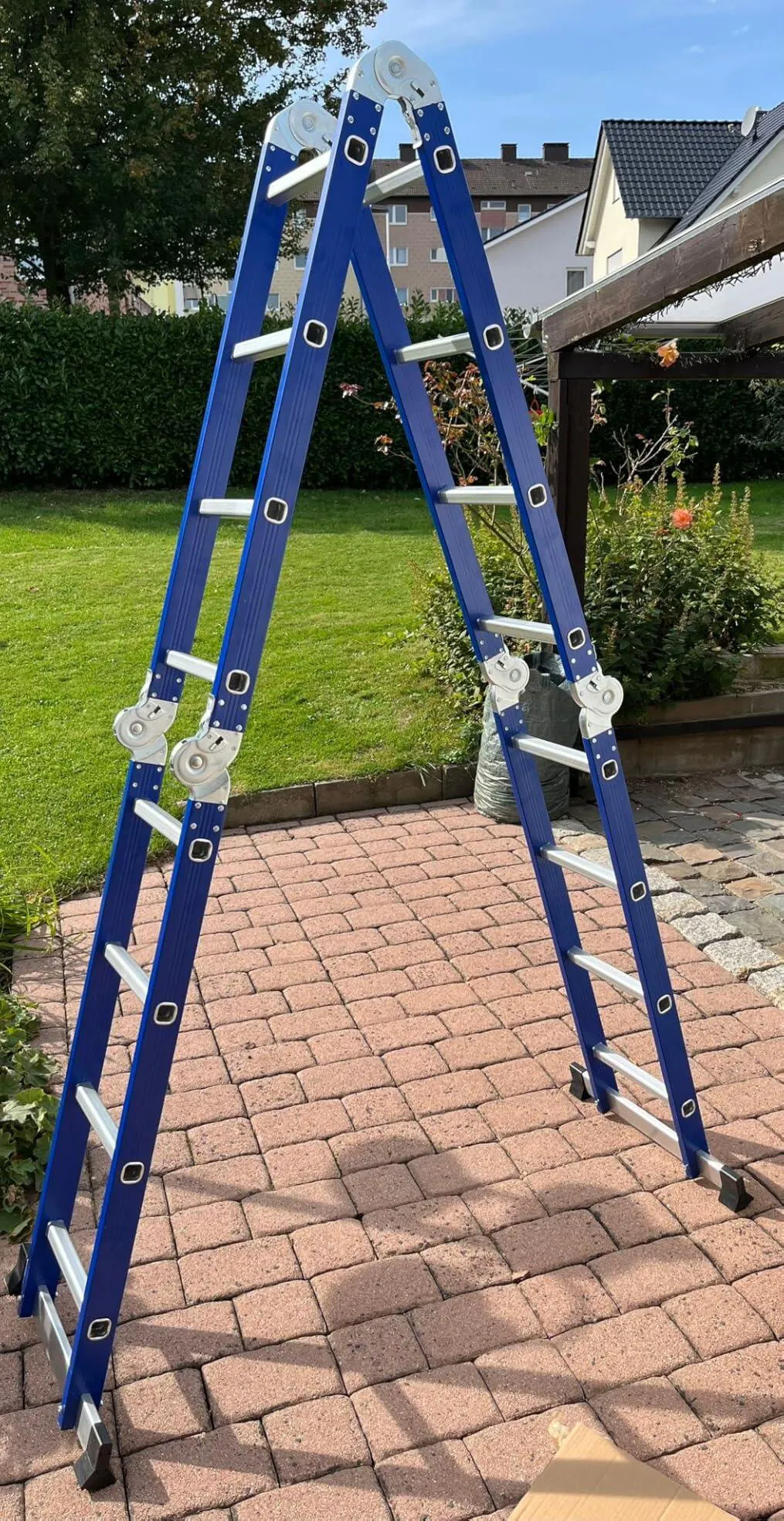 Als ich die vielseitige Aluminium-Leiter ausgepackt habe, war ich zunächst sehr überrascht, wie kompakt sie in der Kiste ankommt. Auf den ersten Blick wirkt sie robust und das Aufrichten klappt fast von selbst – alles ist intuitiv und ohne viel Herumfummeln. Die verschiedenen Einsatzmöglichkeiten finde ich sehr praktisch, ob im Garten oder bei Renovierungsarbeiten, die Leiter passt sich schnell an.